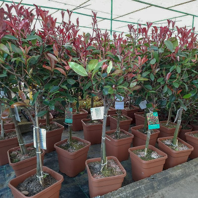 La photinia es un arbusto de hoja perenne que se caracteriza por sus hojas de color rojo, debido a su adaptabilidad a la poda, las hemos formado en árbol de copa, perfecto para decorar cualquier espacio