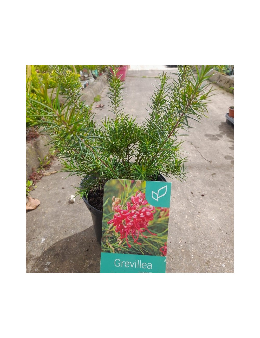 La Grevillea Juniperiana es un arbusto de porte medio, con hojas finas y puntiagudas de un color verde intenso.   Es un arbusto de hoja perenne, con lo que estará verde y con hojas todo el año   Las flores son pequeñas y alargadas de color rojo a las que suelen llamar "lengua de dragón" por su forma, salen en las puntas de las ramas.   Se adapta perfectamente al frío y es muy tolerante al calor y a la exposición al sol. Es muy resistente a la sequía y a los suelos pobres y arcillosos.   Es perfecto para principiantes en su jardín, patio o terraza.   Época de floración: pueden llegar a florecer todo el año, dependiendo de la zona, pero su mayor floración es en primavera y verano   Maceta de 2 litros, altura aproximada 30/40 cm