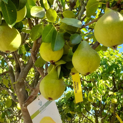 FRUTO: También llamada morettini procede de Italia, es una pera de tamaño medio, su piel es lisa, fina y brillante ,de color amarillo verdoso con chapa roja donde le da el sol, la pulpa es de color amarillento, con textura mantecosa, jugosa con un buen sabor agridulce, limonado, fresco muy bueno