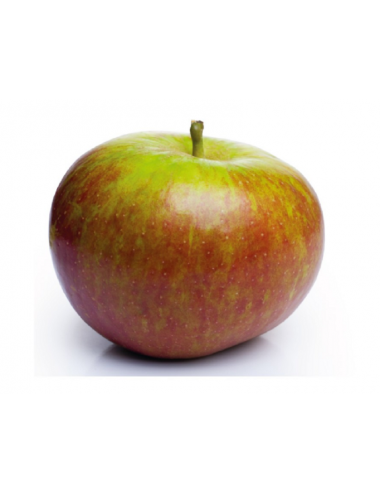 FRUTO: Manzana roja con vetas, de tamaño grande y achatada, tipo reineta, de sabor intenso, ligeramente ácida y se puede comer en crudo o asada.