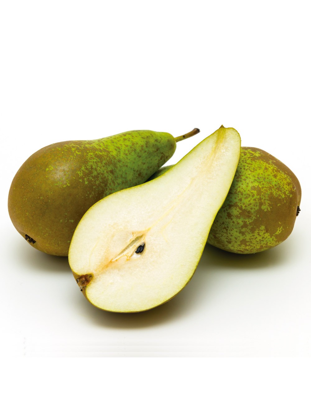FRUTO: Pera en forma de botella de tamaño medio, su piel es gruesa, de color verde con manchas pardas, "russeting" muy característico de esta variedad. Su carne es blanca, de sabor muy dulce, fina y jugosa, blanda y acuosa que se derrite en la boca