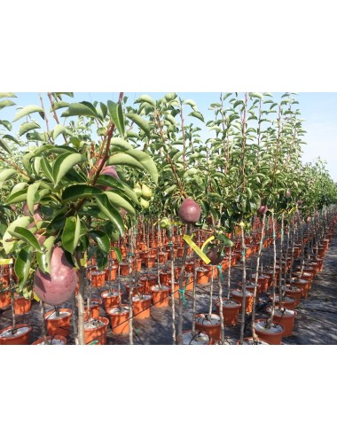 FRUTO: Pera de tamaño grande de color rojo. De carne dura, ligeramente granulada, con un sabor dulce muy agradable y acuosa si está bien madura