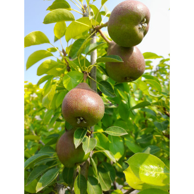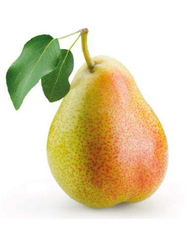 FRUTO: Pera de tamaño medio de color verde y chapa roja donde le da el sol. De carne dura de color blanco, textura fundente, muy jugosa, sabor dulce y aromático ligeramente almidonado.
