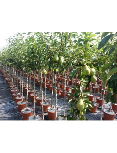 FRUTO: Pera de tamaño grande y ligeramente alargada, su piel es lisa de color amarillento cuando está bien madura. La carne es de color pálido, fina y aromática, jugosa y muy dulce cuando está bien madura