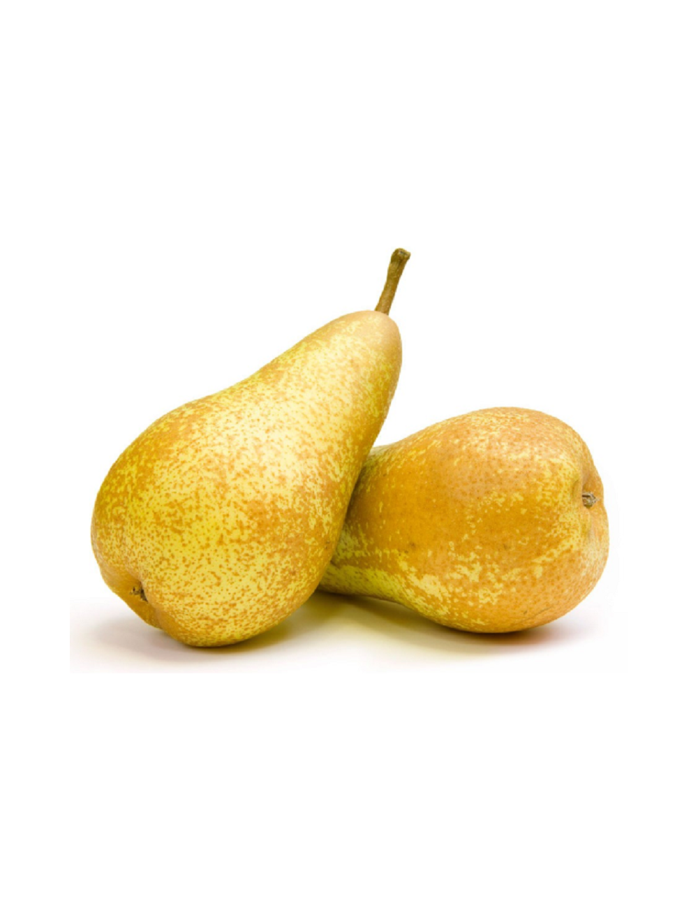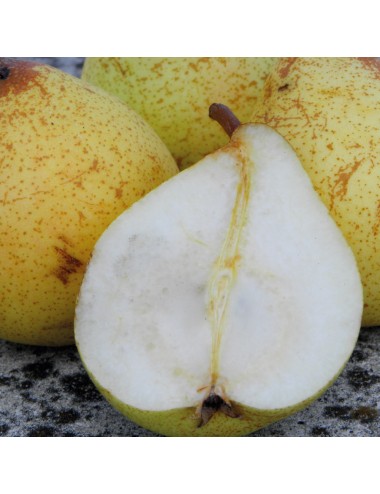FRUTO: Pera de tamaño medio/grande, piel gruesa de color amarillo/pardo, moteada. De carne dulce, blanda, fina, jugosa y aromática.