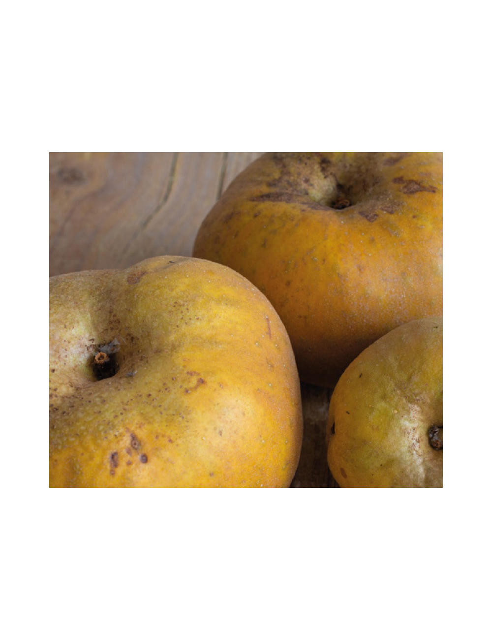 FRUTO: Manzana de color pardo y ligeramente rugosa, también llamada reineta parda o de piel de sapo, su piel es blanda y la carne harinosa, en verde es bastante ácida, y según madura se compensa esa acidez con el dulzor. Buena manzana para guardar y de las mejores para asar