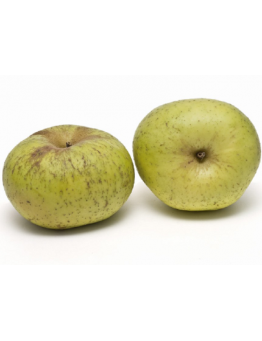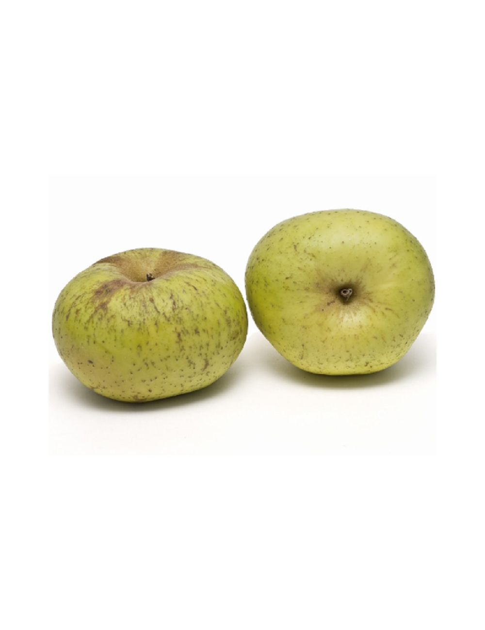 FRUTO: Manzana verde moteada de tamaño medio/grande y más alargada que la reineta blanca, si se recoge verde como en la foto, su carne es bastante crujiente y ácida, aguanta muy bien el guardado y va tornando a tonos más amarillos, sabor más dulce y carne más blanda
